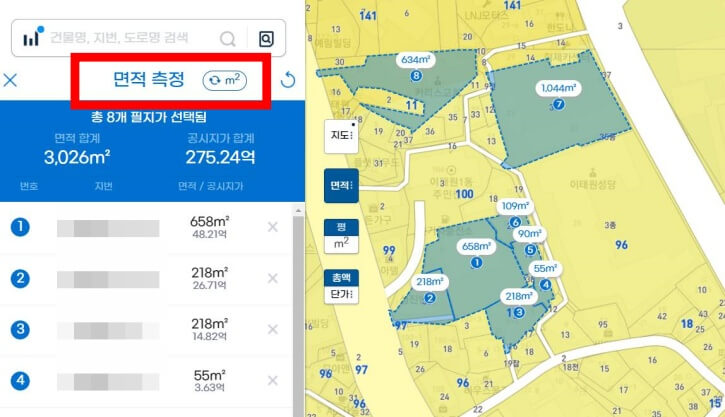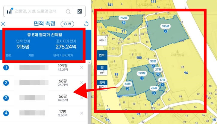 지도를 보고 측정하고자 하는 여러 필지를 클릭하면 좌측에 목록이 형성되고 그 위에 면적합계와 공시지가 합계를 확인 하실 수 있습니다.